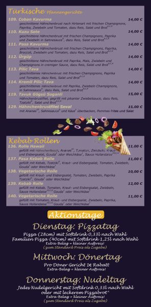 Donnerstag: 11:00 - 14:00 Uhr und 17:00 - 23:00 Uhr